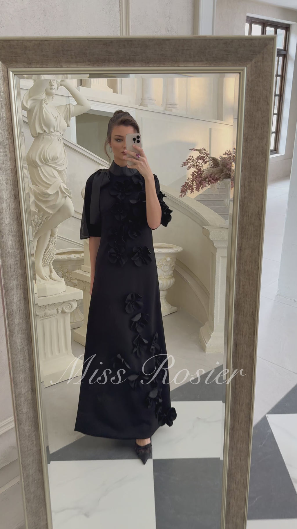 Isidora Schwarzes Maxikleid mit Schleife und Blumenapplikation